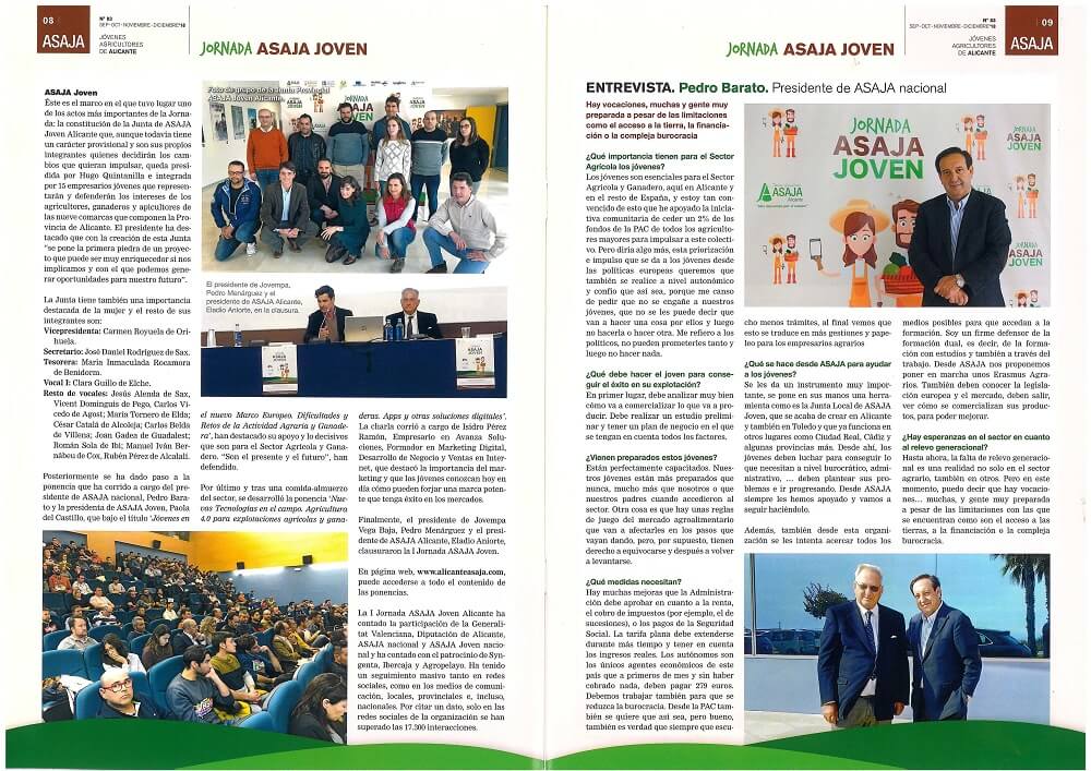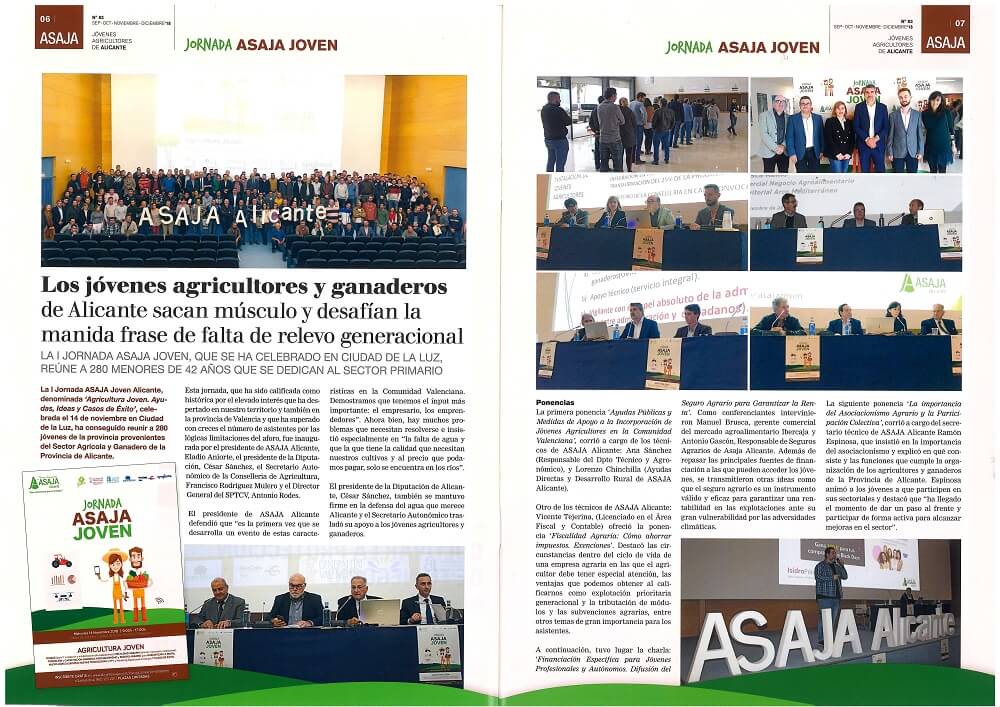 En esta revista se realiza un resumen de la I Jornada ASAJA Joven donde nuestro gerente Hugo Quintanilla fue nombrado presidente de los Jóvenes Agricultores de la provincia de Alicante.