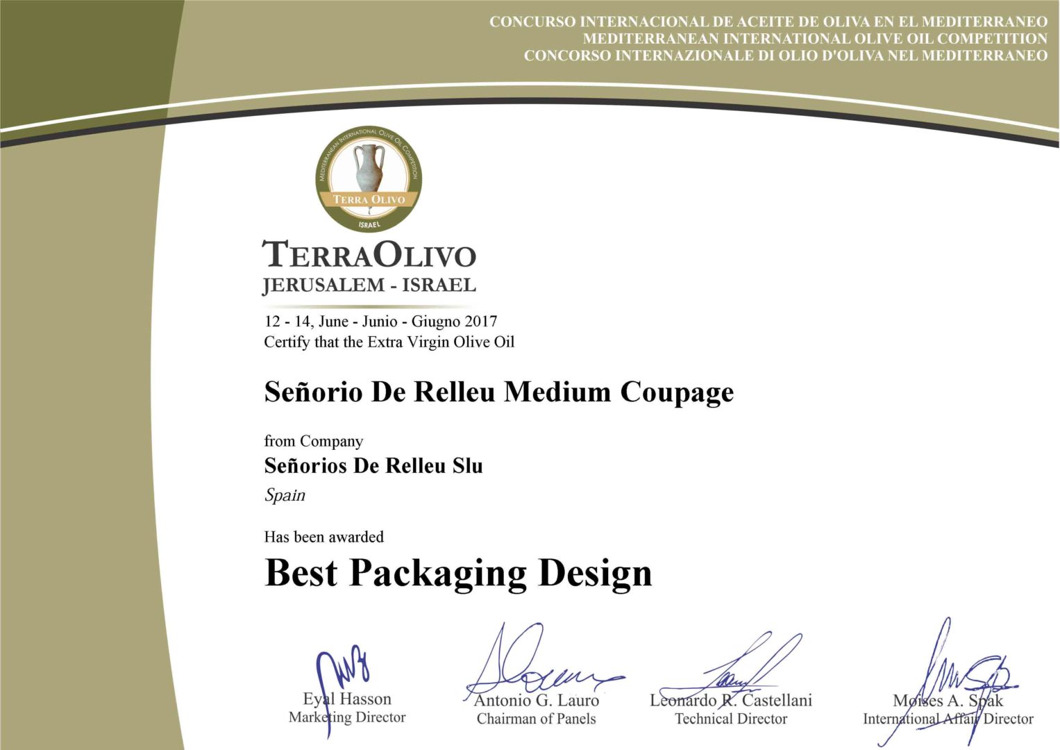 For the seventh consecutive year we have won the “Great Prestige Gold: Great Prestige Gold” award at the Terraolivo 2017 contest (one of the most recognized) organized in Israel as one of the best oils in the world. And also the Best Packaging Design award of the organization to one of the best dressed oils.