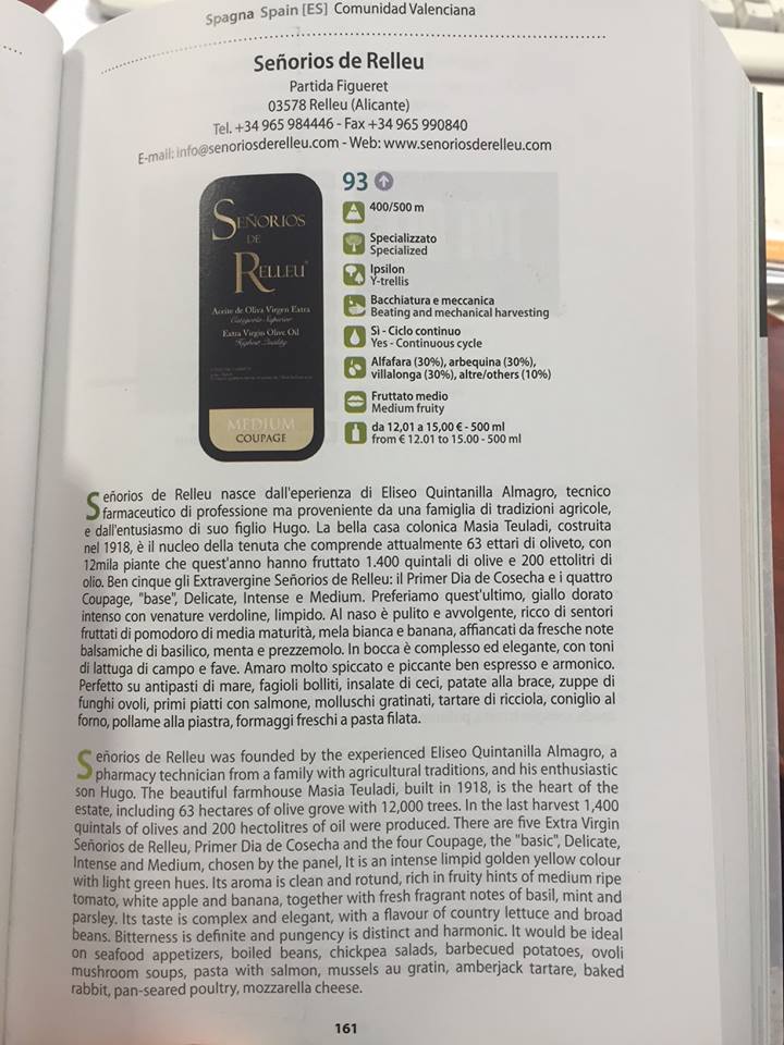 Señoríos de Relleu nasce dall´eperienza di Eliseo Quintanilla Almagro, tecnico farmaceutico di professione ma proveniente da una famiglia di tradizioni agrícole, e dall´entusiamo di suo figlio Hugo. La bella casa colonica Masia Teuladi, costruita nel 1918, è il nucleo della tenuta che comprende attualmente 63 ettari di oliveto, con 12 mila plante che quest´anno hanno fruttato 1.400 quintali di olive e 200 ettolitri di olio. Ben cique gli Extravergine Señoríos de Relleu: il Primer Dia de Cosecha e i quattro Coupage, “base”, Delicate, Intense e Medium. Preferiamo quest´ultimo, giallo dorato intenso con venature verdoline, limpido. Al naso è pulito e avvolgente, ricco di sentori fruttati di pomodoro di media maturità, mela bianca e banana, affiancati da fresche note balsamiche di basilico, menta e prezzemolo. In bocca è complesso ed elegante, con toni di lattuga di campo e fave. Amaro molto spiccato e piccante ben espresso e armonico. Perfetto su antipasti di mare, fagioli bolliti, insalate di ceci, patate alla brace, zuppe di funghi ovoli, primi piatti con salmone, molluschi gratinati, tartare di ricciola, coniglio al fomo, pollame alla piastra, formaggi freschi a pasta filata.