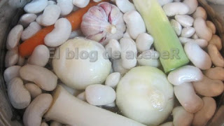 Para cocer cubrimos los judiones con agua mineral, añadimos las zanahorias, cebollas frescas, el puerro y la cabeza de ajo.