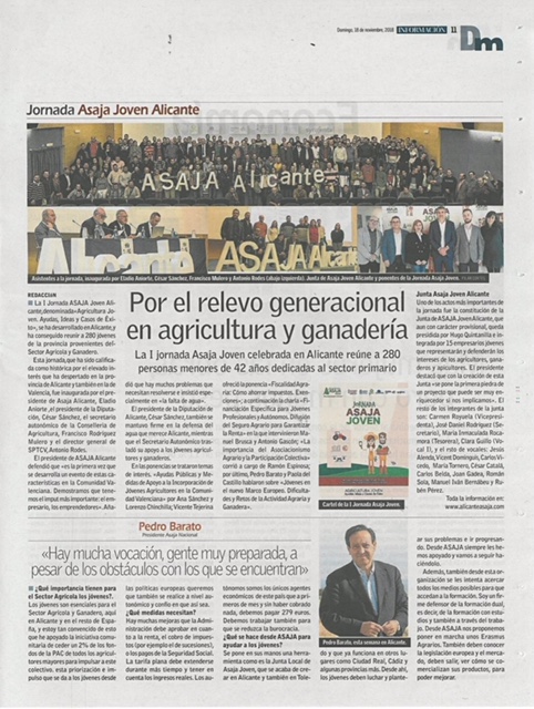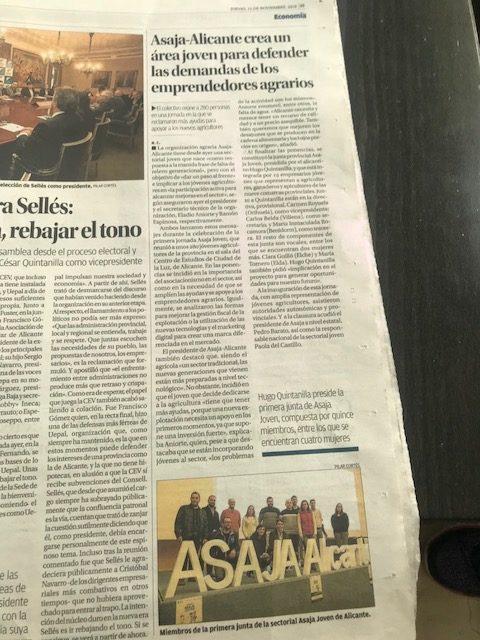 Por otro lado, agradecemos a ASAJA Alicante su interés y esfuerzo por hacer realidad esta iniciativa y organizar la jornada ASAJA Joven. Así mismo, la difusión de estas noticias en el “Diario Información de Alicante” del pasado jueves día 15 y domingo día 18 de noviembre. Os dejamos con los artículos y con fotografías del evento donde se puede ver a Hugo Quintanilla con el grupo ASAJA.
