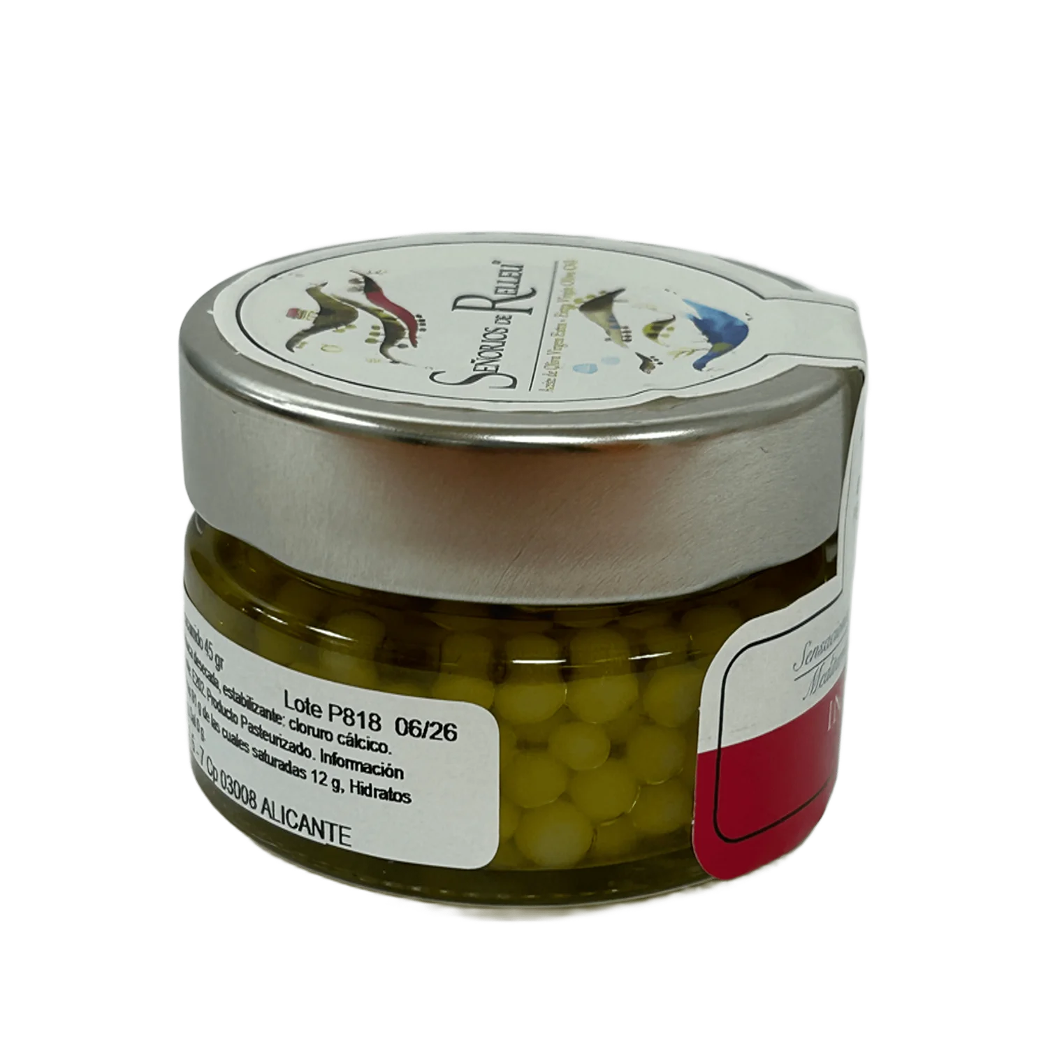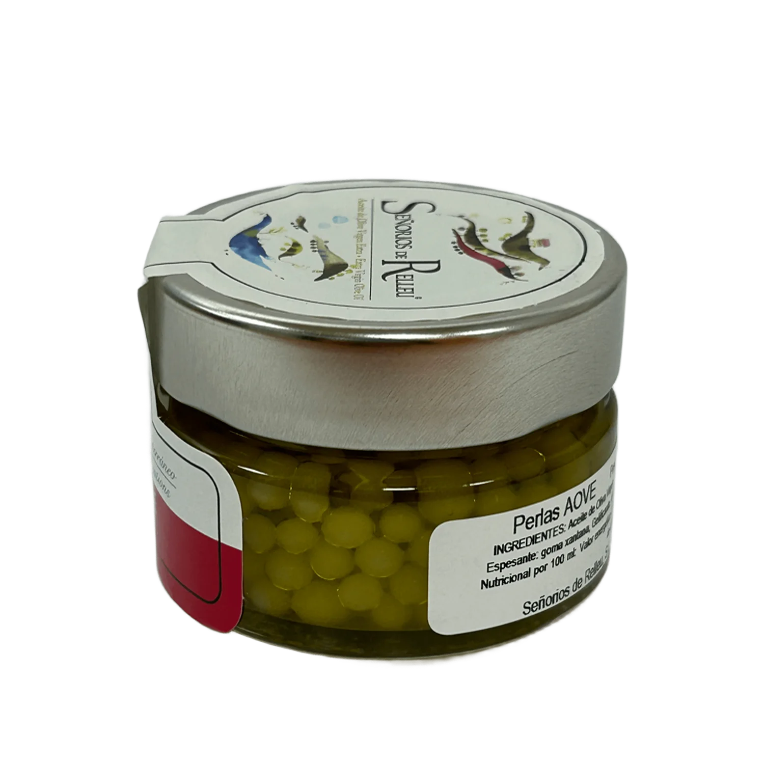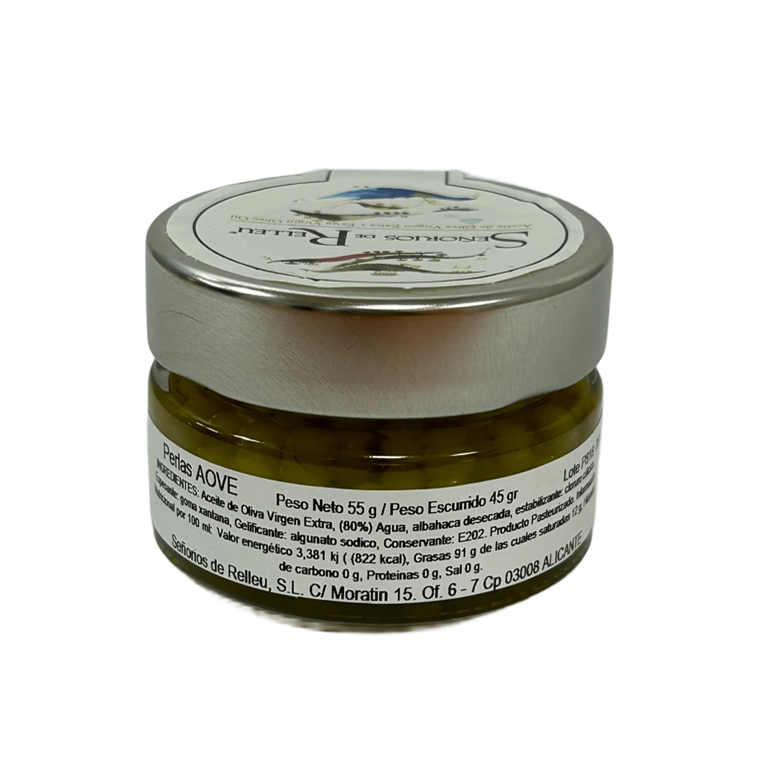 Aceite de Oliva Virgen Extra Señoríos de Relleu, agua, gelificante (alginato sódico), estabilizante (cloruro cálcico), espesante (goma xantana), conservante (E202).