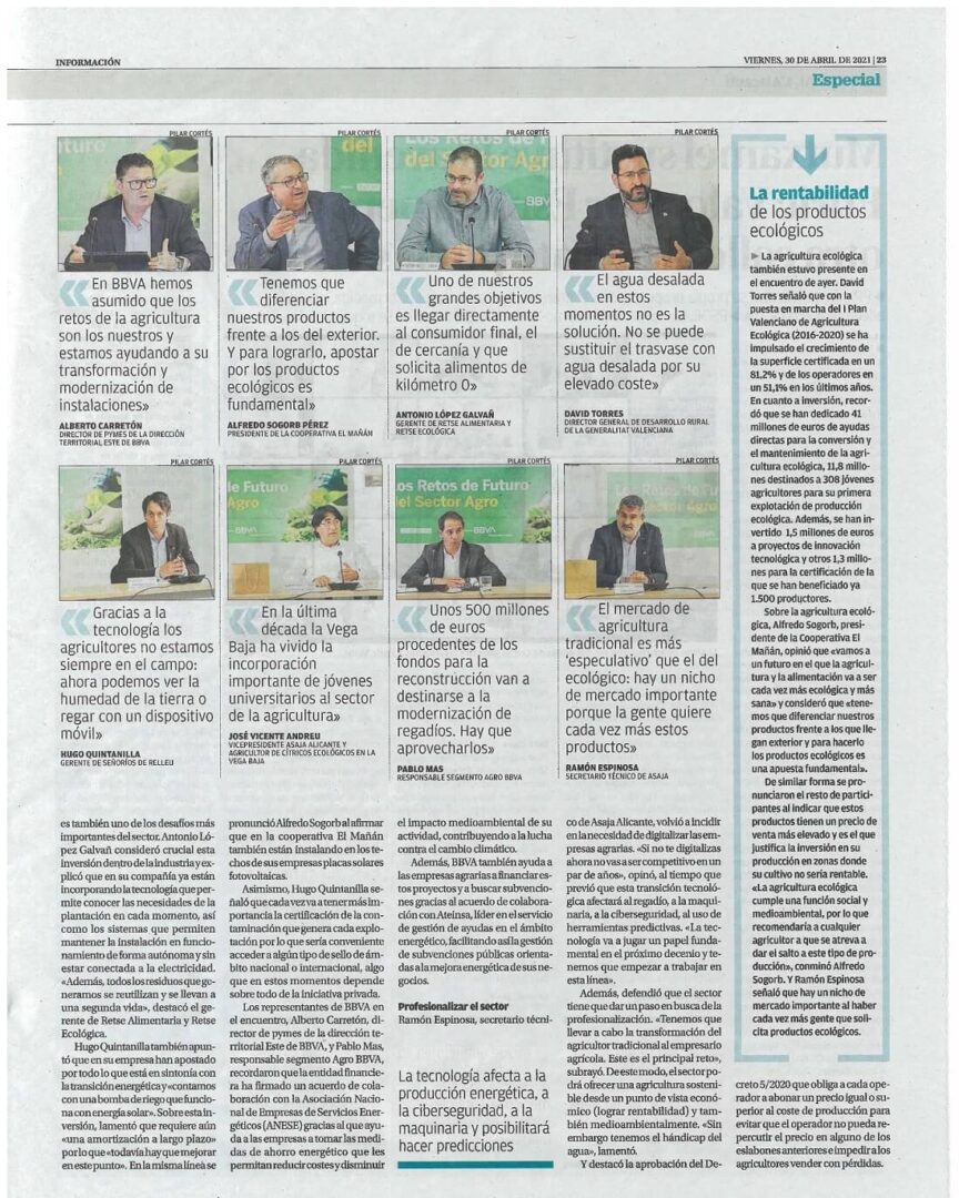 Para analizar la actualidad del sector agrario y de los desafíos más apremiantes a los que se enfrenta esta industria, el periódico INFORMACIÓN y BBVA organizaron la jornada titulada “Los Retos del Sector Agro” donde representantes y profesionales del sector dieron su punto de vista sobre las tendencias que van a marcar su futuro más inmediato.
